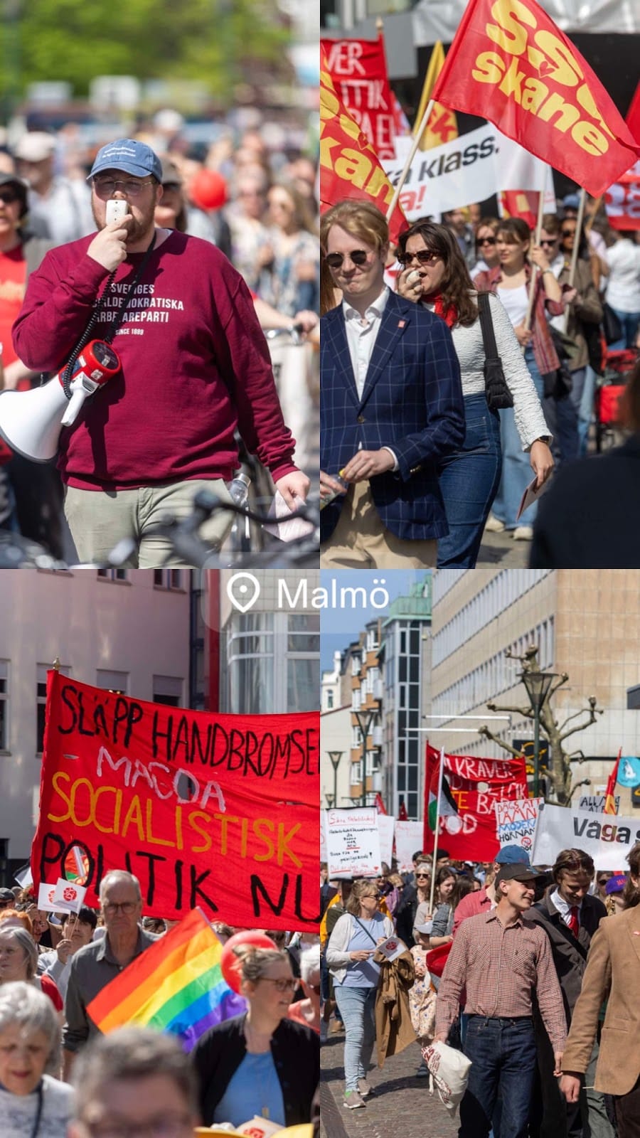Efter tåget talade SSU om behovet av att prata om klass samt ungas roll i politiken, LO (Erol Dramer) höll tal om behovet av kollektivavtal, medan ordföranden i Malmös kommunstyrelse (Katrin Stjärnfäldt Jammeh) berörde världsläget och var de konkret gör i Malmö för att förbättra situationen. Sen var det dags för Magdalena. Hon höll ett starkt tal som dock präglades av tumult. Inledningsvis tjöt en demonstration för Palestina med tutor så att man inte hörde vad hon sa. Därutöver försökte Återställ Våtmarker ta sig upp på scenen.