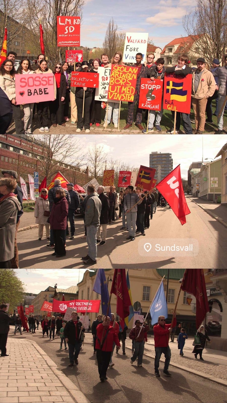 Regn byttes ut mot sol lagom till första maj i Sundsvall, rapporterar Jimmy. Hundratals demonstranter tågade fram, många av dem barn med sina egna plakat: "Stoppa Trump och Putin", "Mer godis till barnen" och det tydliga budskapet "Vi vill inte ha rasist". Det satte tonen för en dag där även de yngsta visade att politik angår alla generationer.